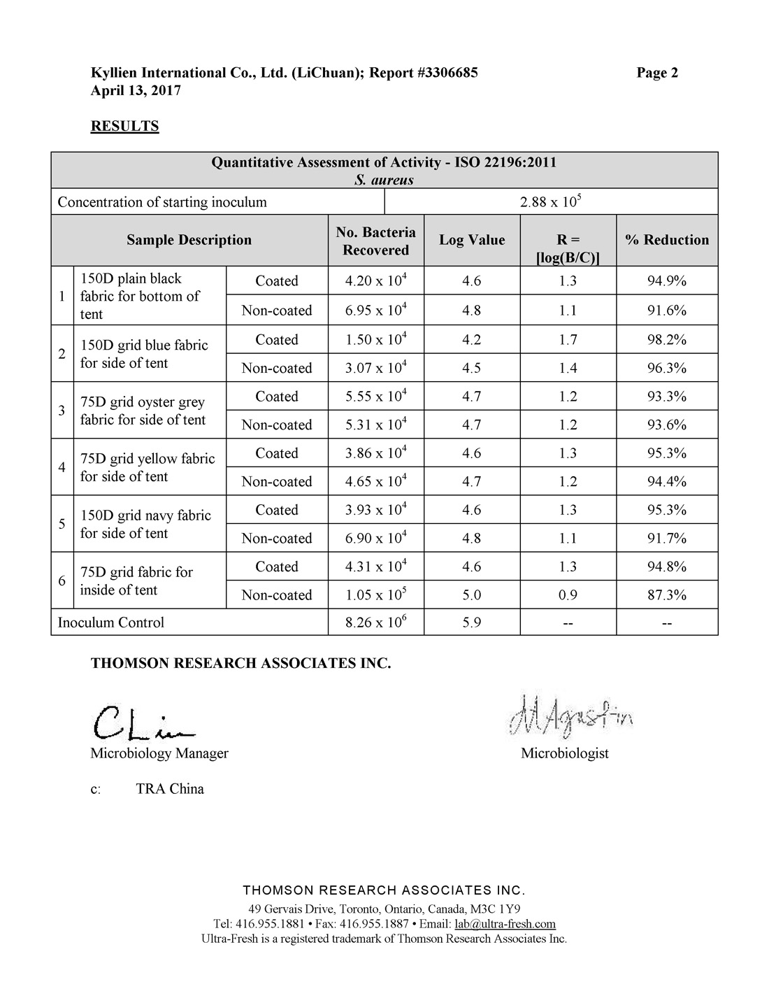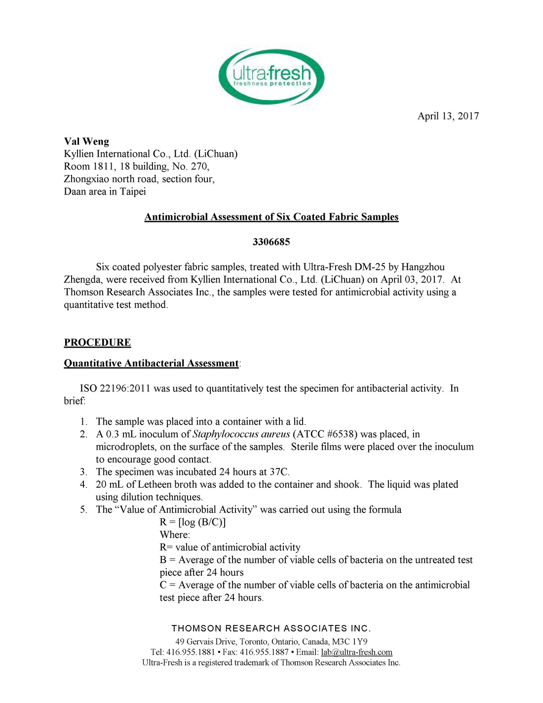 經加拿大Thomson Research Associates Inc實際測試,再經過50次水洗或雨淋,仍可達到99%以上的抗菌效果。Ultra Fresh為了滿足國際規管要求,必須通過最嚴格的安全和性能測試程序。Ultra Fresh已獲美國EPA認證,而且符合每個銷售國的所有規管要求。